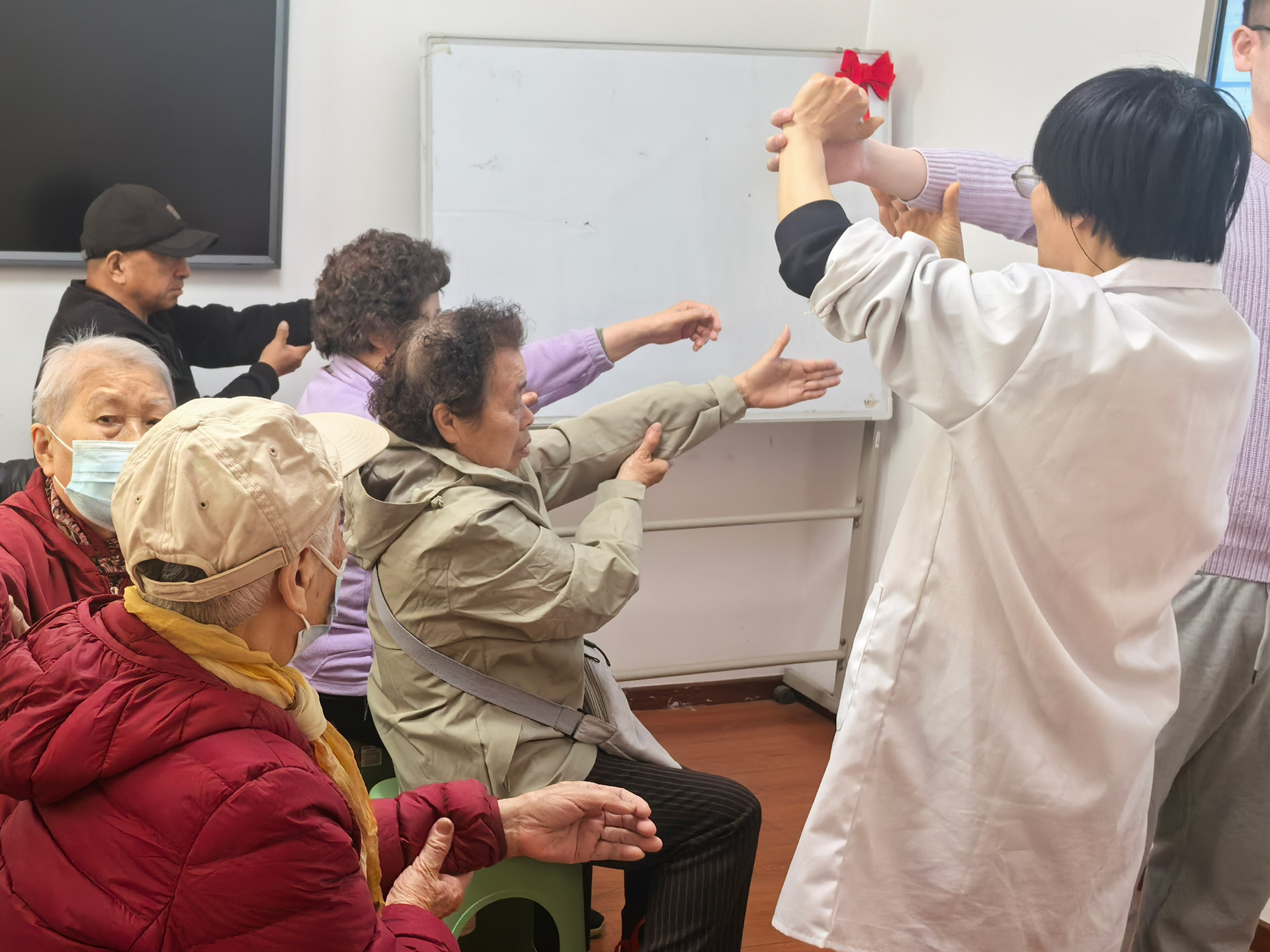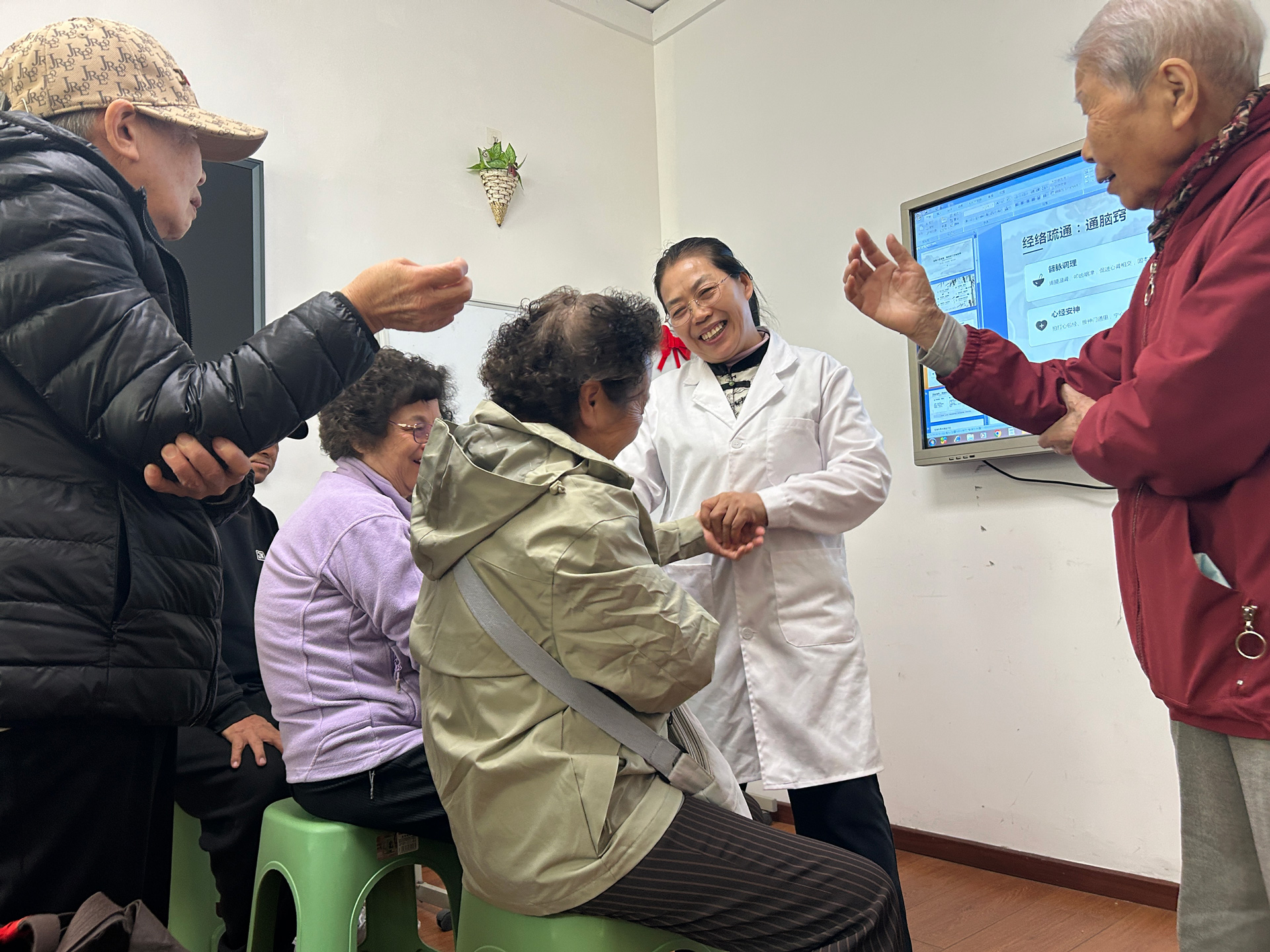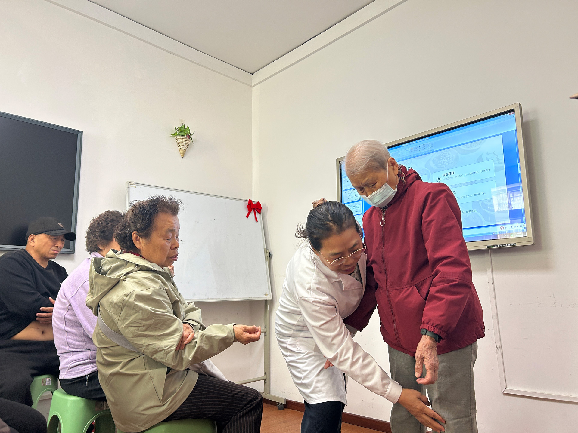 随着活动现场氛围愈发热烈,妙承健康工作室特色康复理疗师、非遗传承人闻秀兰,为大家带来了接地气的穴位养生保健内容。她亲自示范、手把手教学,耐心指导居民寻找鹤顶、合谷等常用养生穴位,细致讲解每个穴位的功效与正确按摩手法,还主动邀请居民上前体验,一对一纠正操作姿势,让大家在轻松愉悦的氛围中,学会了简单实用的居家养生技巧。